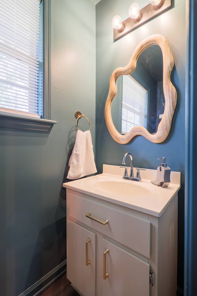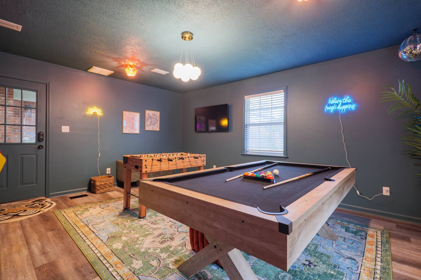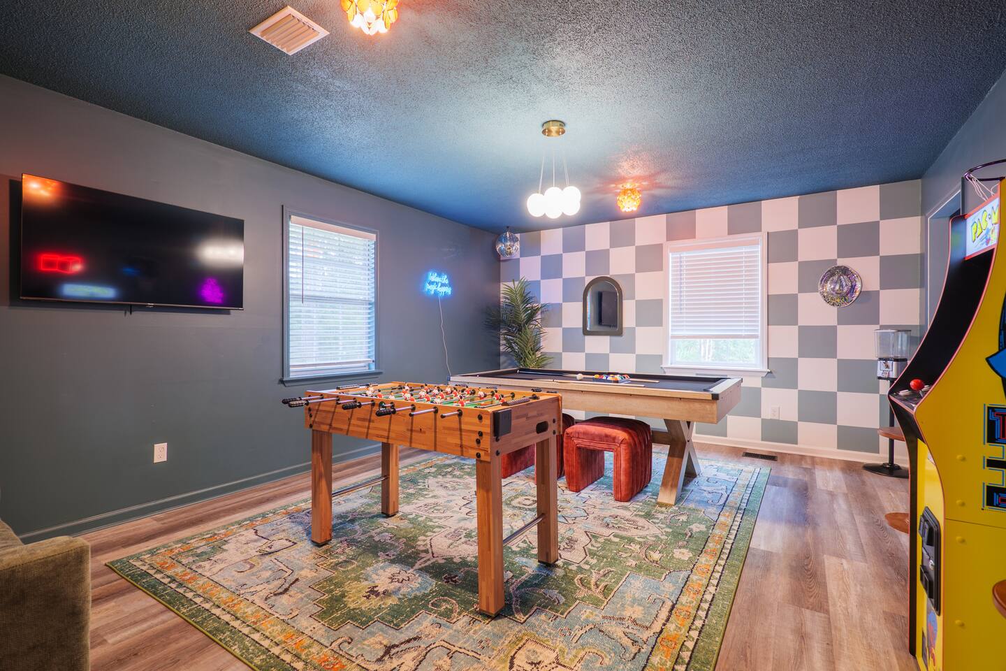 Relax in this spacious retreat packed with entertainment and comfort for families or groups. •3 king beds with TVs in every bedroom, living room, and game room •Game room with Pac-Man arcade, pool table, foosball, and flat-screen TV •Covered porch with life-size Connect 4, ring toss, and seating area •Outdoor porch with grill and additional seating •Fully equipped kitchen and dining space •5 smart TVs and free Wi-Fi throughout •Washer and dryer for convenience •17 minutes from Wild Adventures