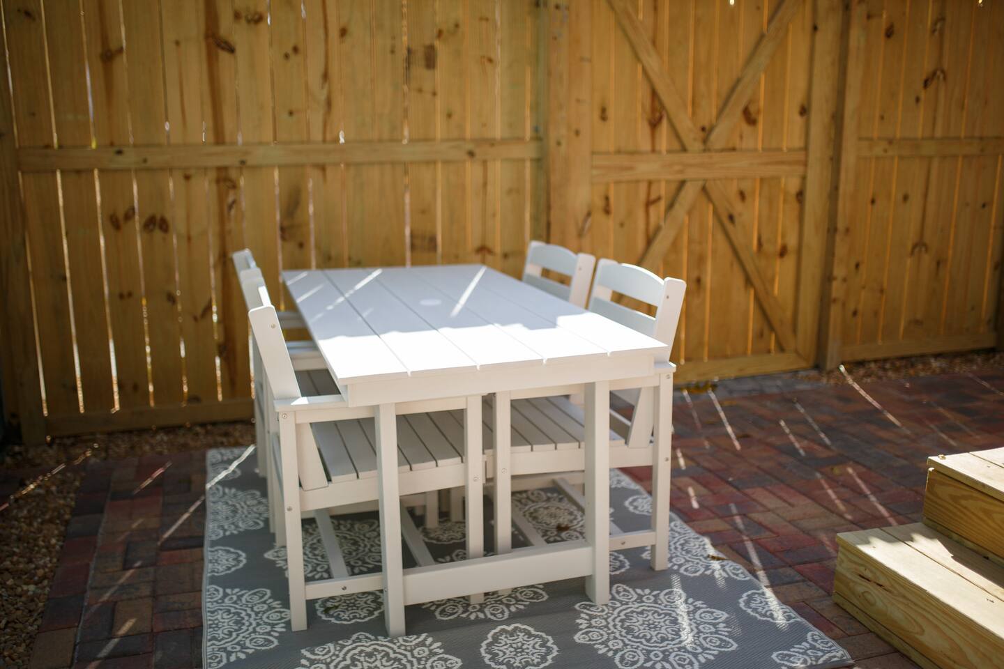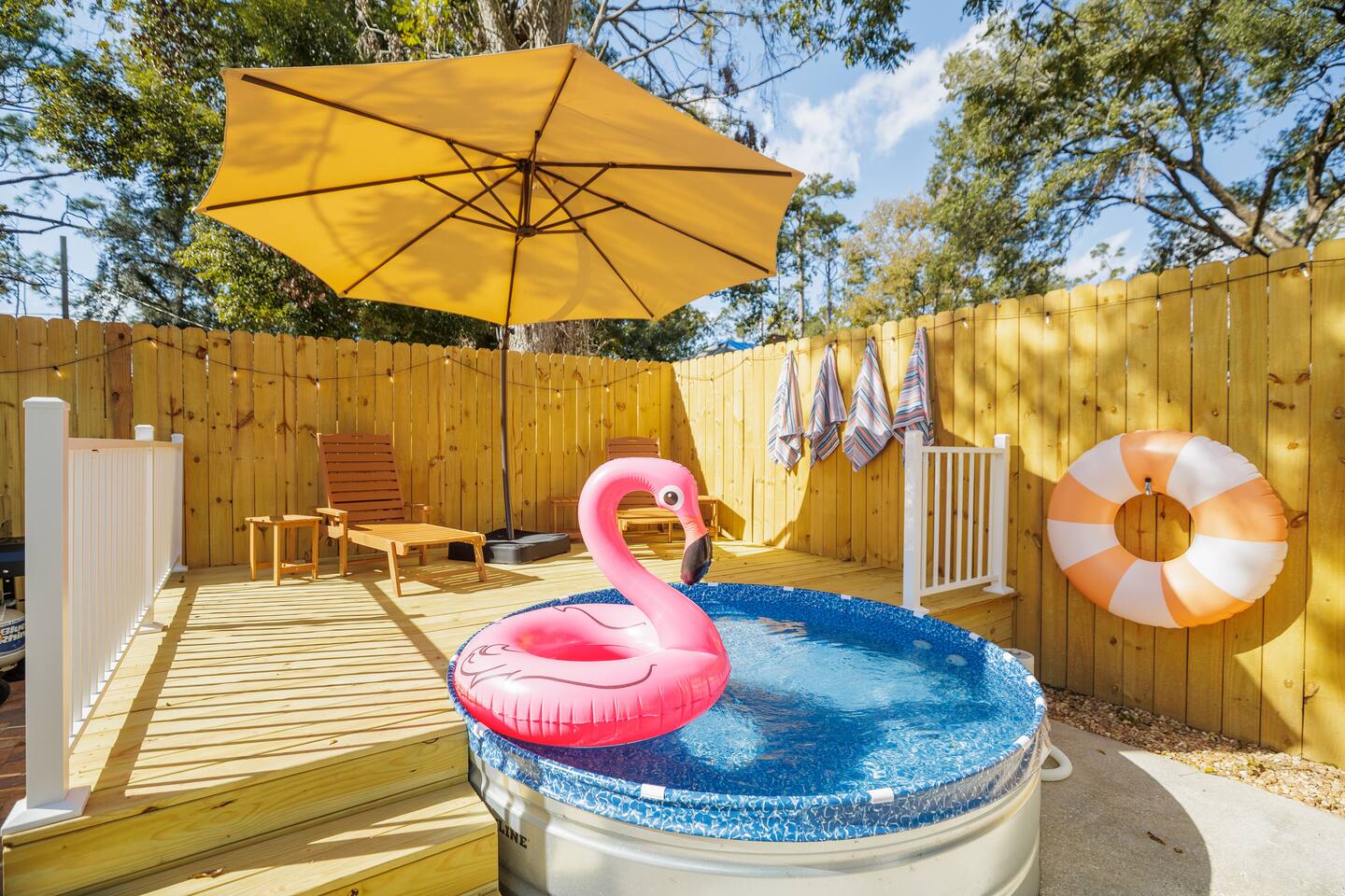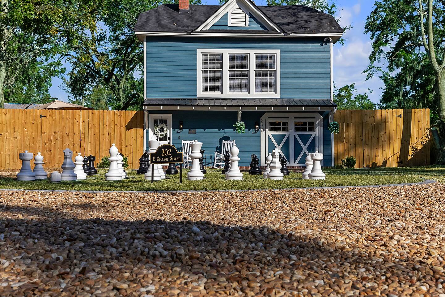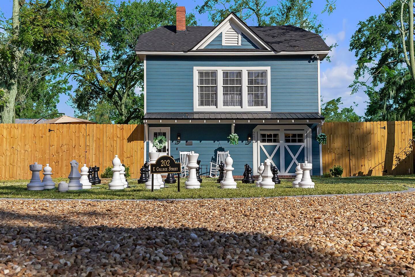 • Sleeps 5 — king bed in primary bedroom, queen bed in second bedroom, couch in living room *Please note guests must climb stairs to access bedrooms. This home is historic, so the stairs may be difficult to climb for young children and those with disabilities. Both bedrooms are located on the second floor. • Upstairs full bathroom with fully tiled tub & shower combo. The water pressure will melt your stress away! • Downstairs half bathroom for convenience • Cowboy pool for warm-weather lounging • Life-size chess, Connect 4, & cornhole • Outdoor dining area, sun loungers & propane grill • Fully equipped kitchen with cooking essentials • Smart TVs & high-speed Wi-Fi • Washer & dryer for guest use- located in the upstairs bedroom • Private outdoor setting • Walk to VSU — minutes from campus, dining & downtown