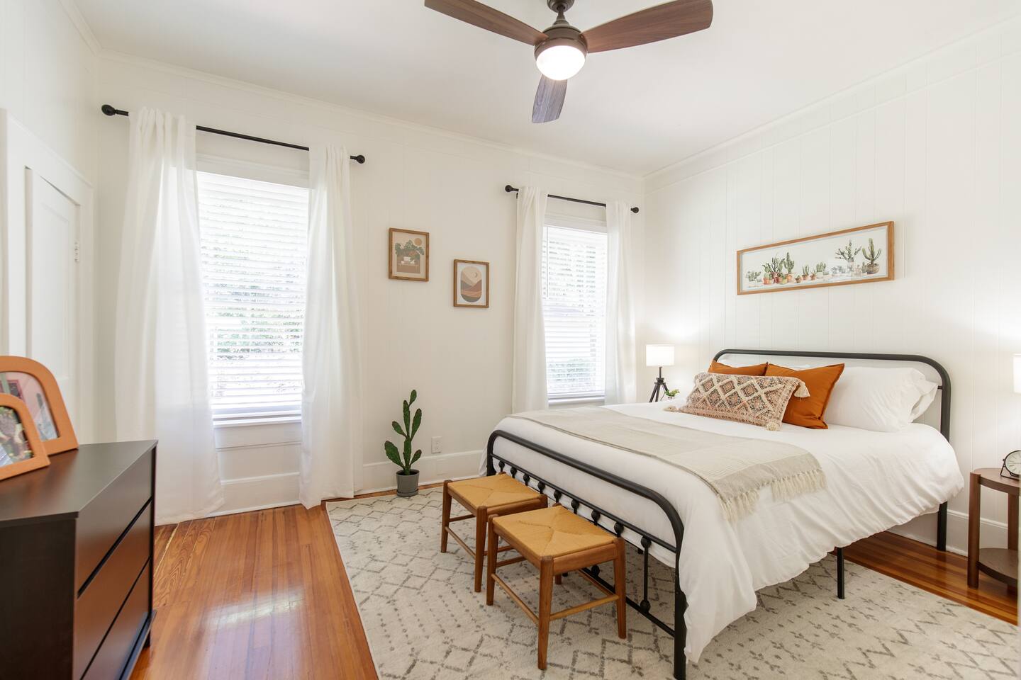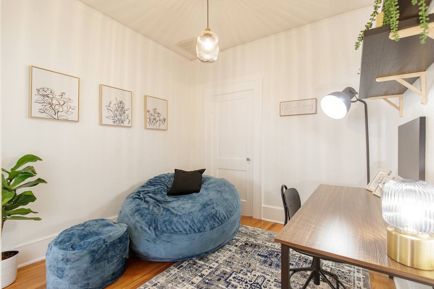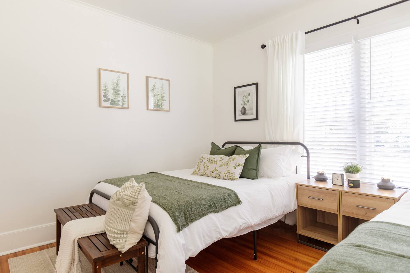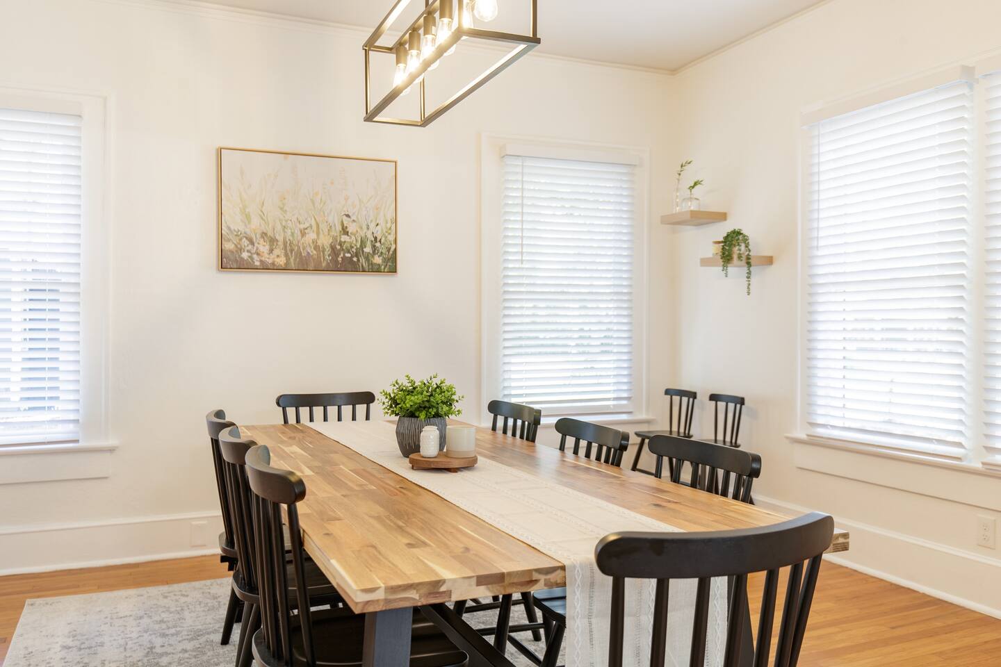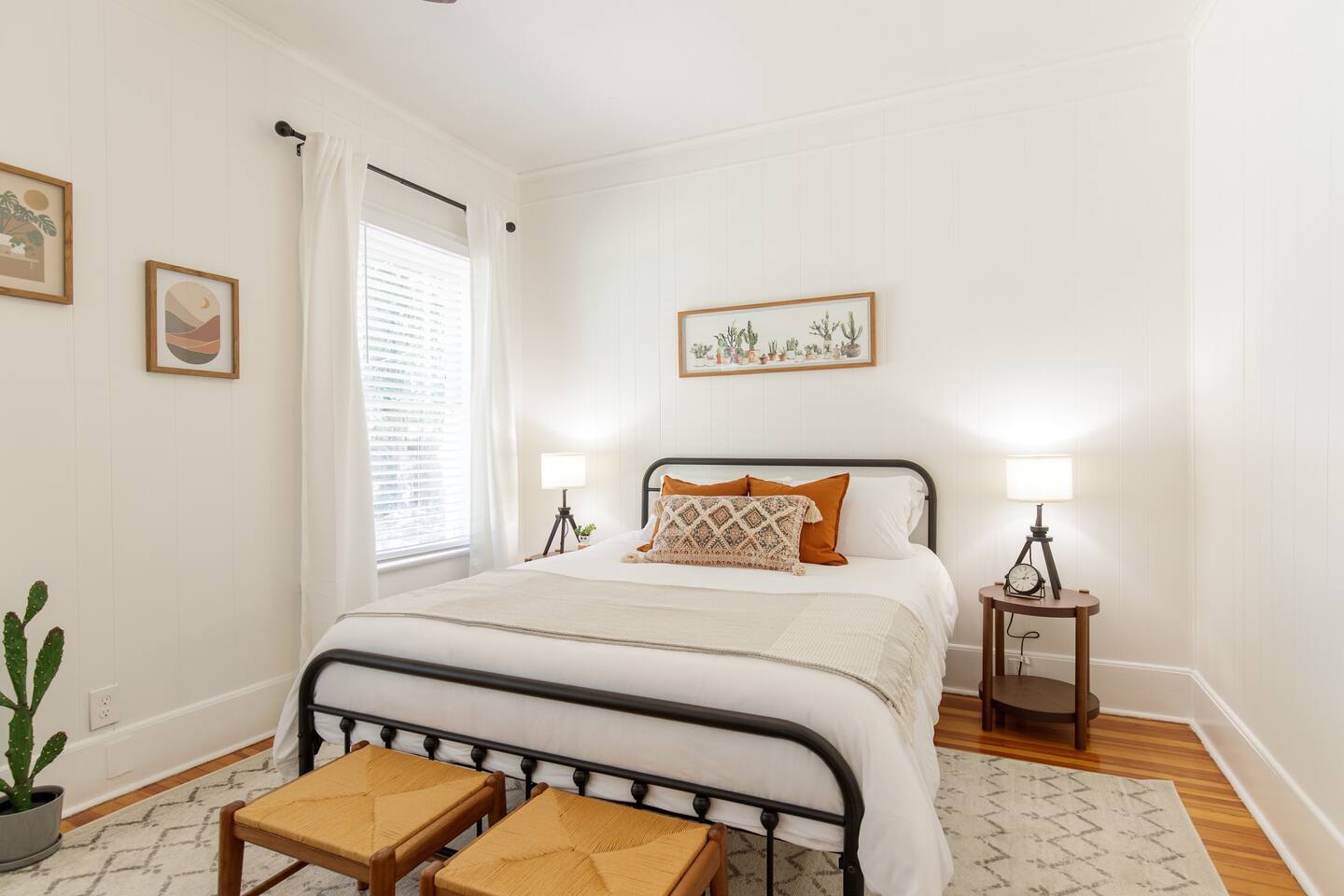 This renovated 100-year-old cottage has been carefully updated while preserving the warmth and charm that make it special. 🛏 Sleeping & Layout -King primary suite with private bath -Bedroom with two queen beds -Additional queen bedroom -Twin daybed in sunroom -Ideal for families, wedding guests & road trip groups -Most comfortable for 6–8 guests (max 10) 🛋 Living Spaces -Spacious open living & dining area -70” 4K TV for movie nights -Separate office/lounge with desk + oversized beanbag -Light-filled sunroom with hanging egg chair -Multiple cozy nooks for reading or relaxing 🍳 Kitchen & Dining -Fully stocked kitchen for home-cooked meals -Restored vintage cast iron sink -Breakfast nook with French press & drip coffee maker -Coffee, sugar & creamer provided -Dining table seating for 8 🌿 Outdoor Living -Front porch swing & rocking chairs -Fenced backyard (great for kids) -Patio dining area with umbrella -Propane grill for cookouts -Quiet historic neighborhood 📍 Location -3 minutes to VSU -3 minutes to SGMC -9 minutes to Publix -10 minutes to I-75 -19 minutes to Wild Adventures