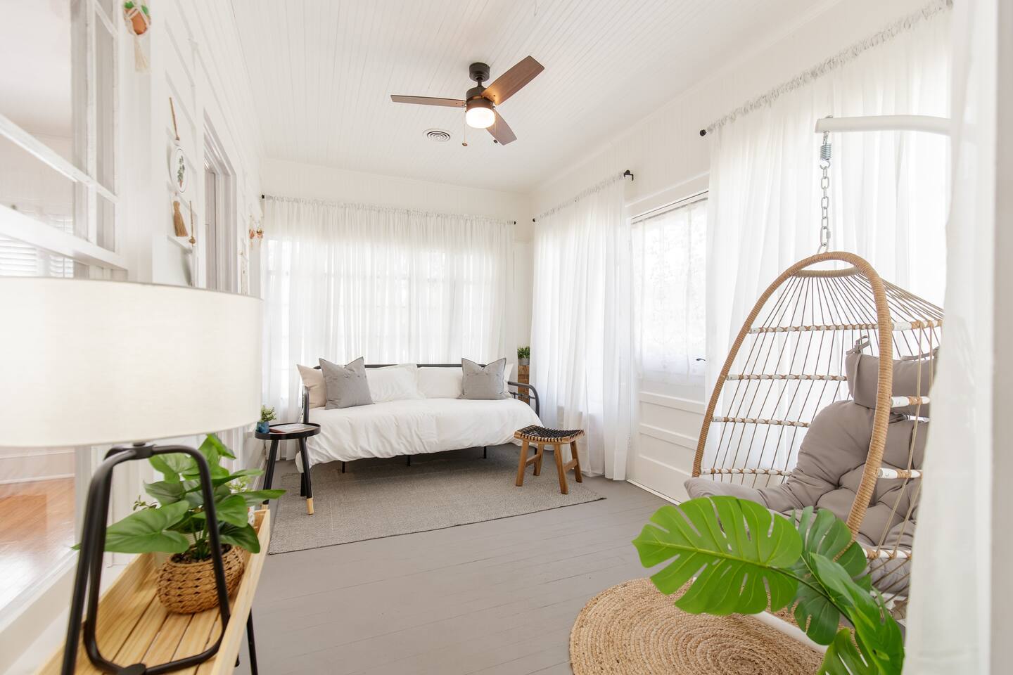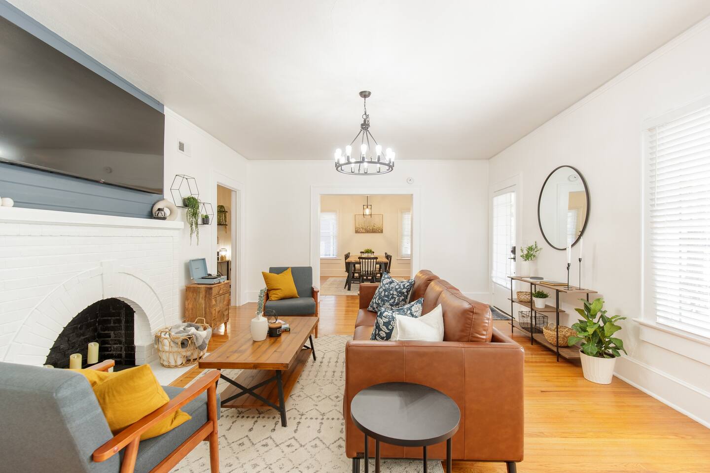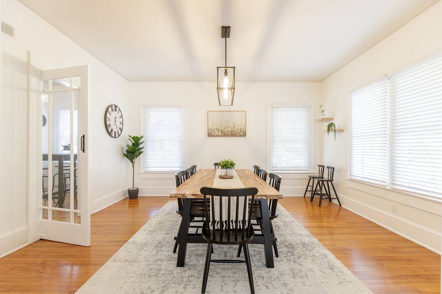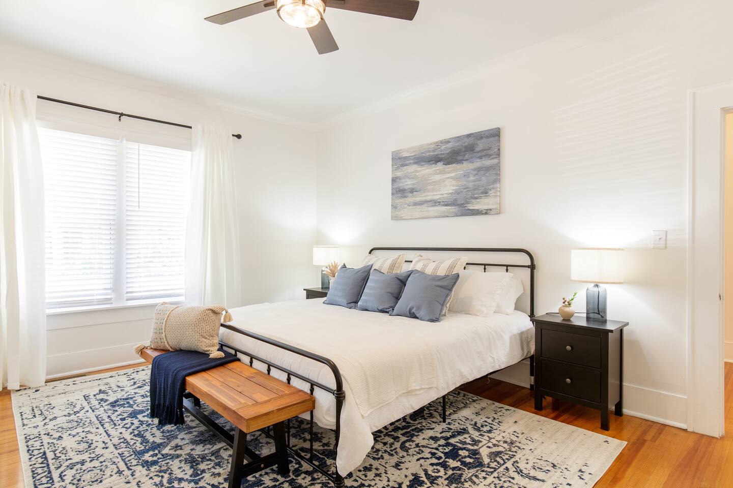 This renovated 100-year-old cottage has been carefully updated while preserving the warmth and charm that make it special. 🛏 Sleeping & Layout -King primary suite with private bath -Bedroom with two queen beds -Additional queen bedroom -Twin daybed in sunroom -Ideal for families, wedding guests & road trip groups -Most comfortable for 6–8 guests (max 10) 🛋 Living Spaces -Spacious open living & dining area -70” 4K TV for movie nights -Separate office/lounge with desk + oversized beanbag -Light-filled sunroom with hanging egg chair -Multiple cozy nooks for reading or relaxing 🍳 Kitchen & Dining -Fully stocked kitchen for home-cooked meals -Restored vintage cast iron sink -Breakfast nook with French press & drip coffee maker -Coffee, sugar & creamer provided -Dining table seating for 8 🌿 Outdoor Living -Front porch swing & rocking chairs -Fenced backyard (great for kids) -Patio dining area with umbrella -Propane grill for cookouts -Quiet historic neighborhood 📍 Location -3 minutes to VSU -3 minutes to SGMC -9 minutes to Publix -10 minutes to I-75 -19 minutes to Wild Adventures